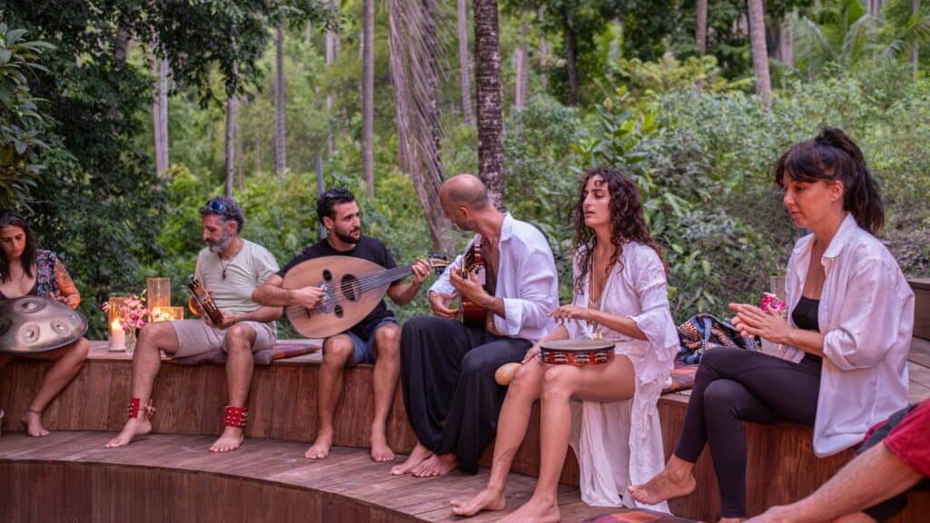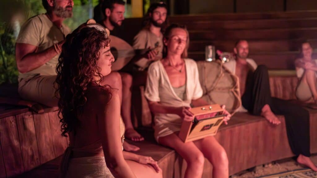 You will unwind in the spa and sauna, gather around evening bonfires under the stars, enjoy live concerts and inspiring performances, relax by the swimming pool, and savor nourishing meals at the on-site restaurant.